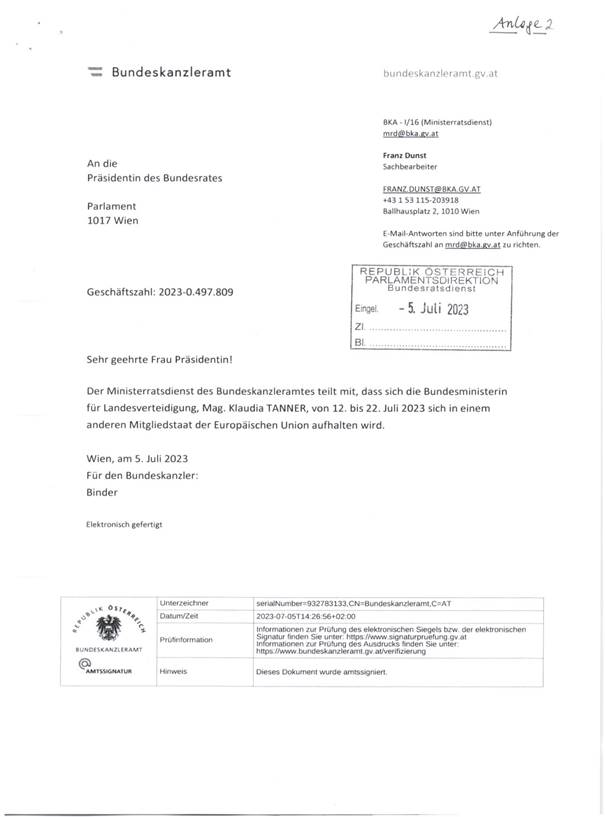 Schreiben des Ministerratsdienstes betreffend den Aufenthalt von Frau Bundesministerin für Landesverteidigung Mag. Klaudia Tanner von 12. bis 22. Juli 2023 in einem anderen Mitgliedstaat der Europäischen Union (Anlage 2)