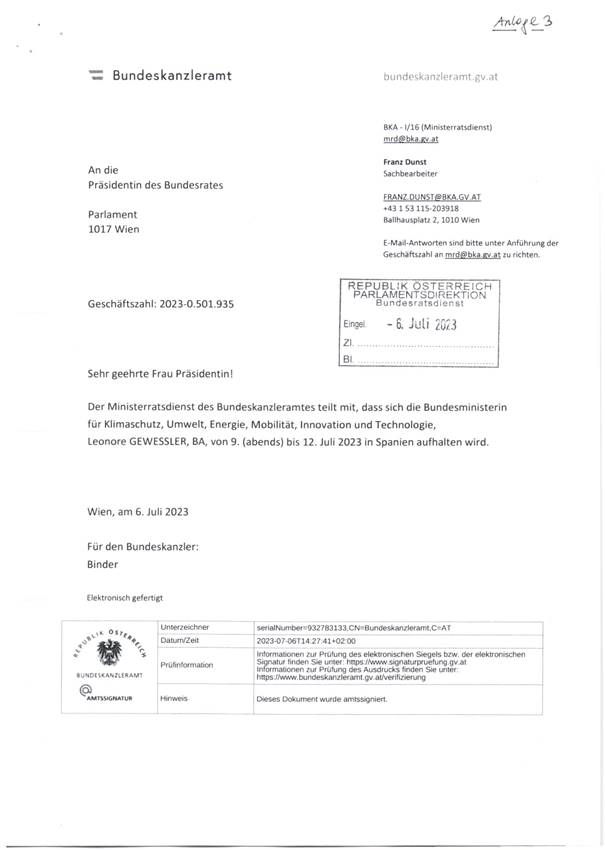 Schreiben des Ministerratsdienstes betreffend den Aufenthalt von Frau Bundesministerin für Klimaschutz, Umwelt, Energie, Mobilität, Innovation und Technologie Leonore Gewessler, BA, von 9. (abends) bis 12. Juli 2023 in Spanien (Anlage 3)