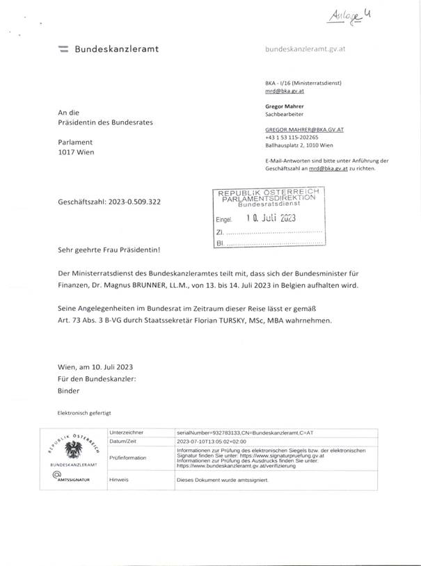 Schreiben des Ministerratsdienstes betreffend den Aufenthalt von Herrn Bundesminister für Finanzen Dr. Magnus Brunner, LL.M. am 13. und 14. Juli 2023 in Belgien (Anlage 4)