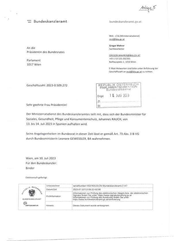 Schreiben des Ministerratsdienstes betreffend den Aufenthalt von Herrn Bundesminister für Soziales, Gesundheit, Pflege und Konsumentenschutz Johannes Rauch am 13. und 14. Juli 2023 in Spanien (Anlage 5)