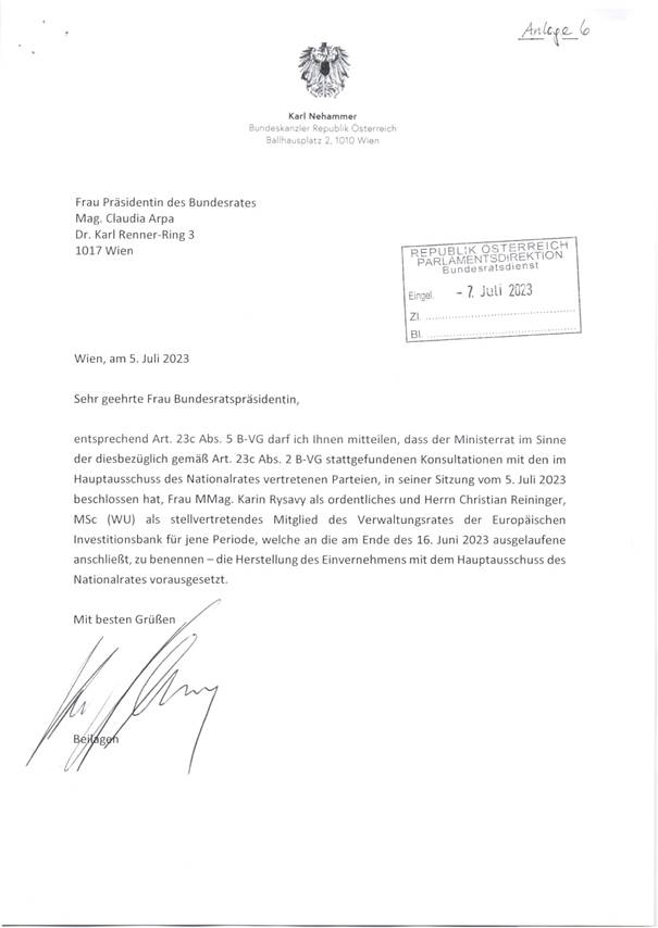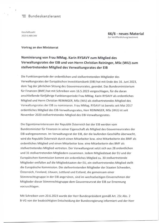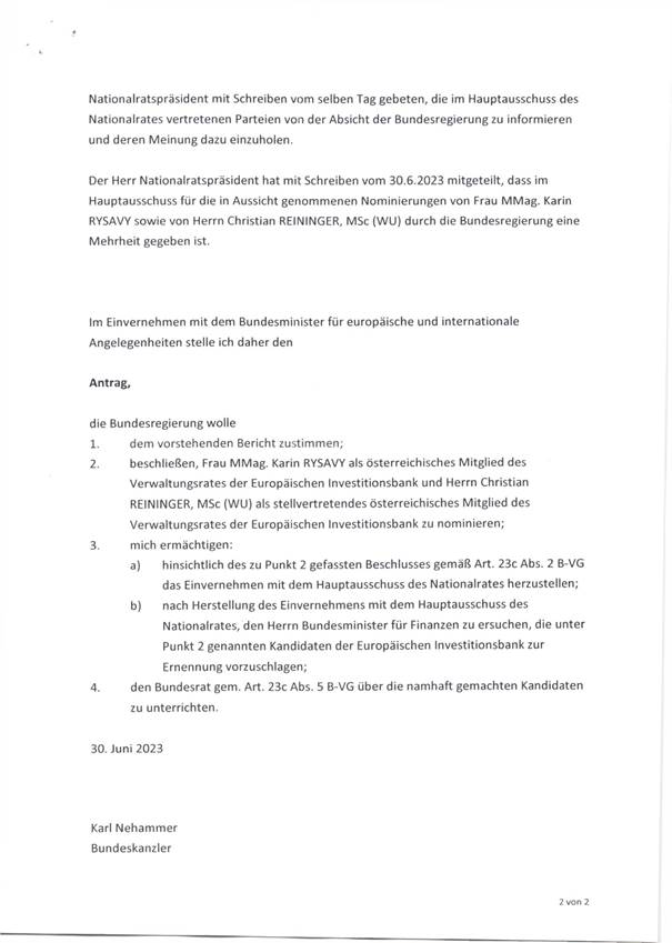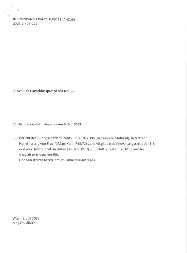 Nominierung von MMag. Karin Rysavy zum ordentlichen Mitglied und Herrn Christian Reininger MSc zum stellvertretenden Mitglied des Verwaltungsrates der Europäischen Investitionsbank für jene Periode, welche an die am Ende des 16. Juni 2023 ausgelaufene anschließt (Anlage 6)