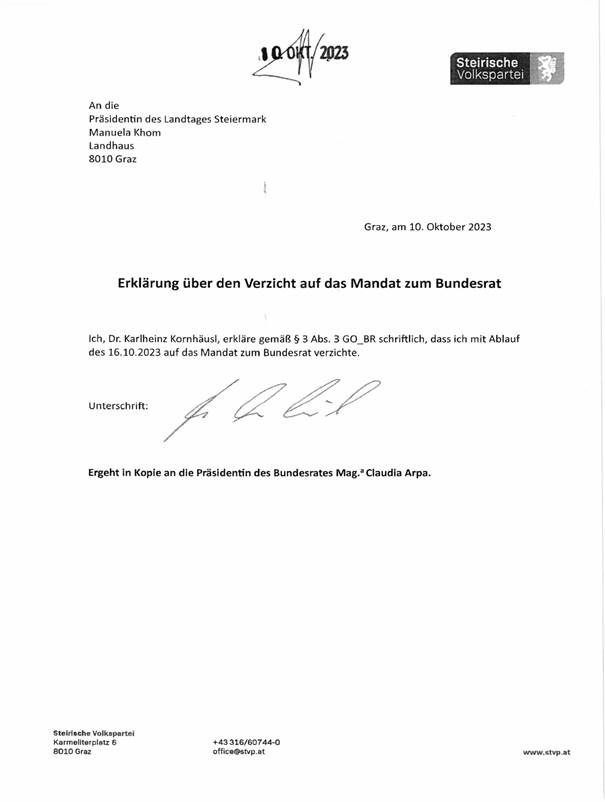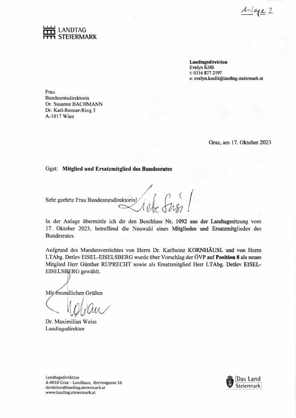 Schreiben des Steiermärkischen Landtages betreffend Mandatsverzichte und Wahl eines Mitgliedes und Ersatzmitgliedes des Bundesrates (Anlage 2)