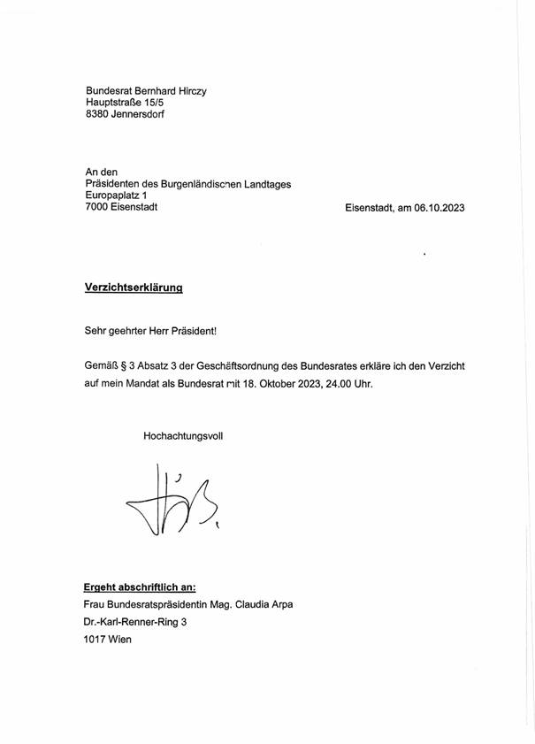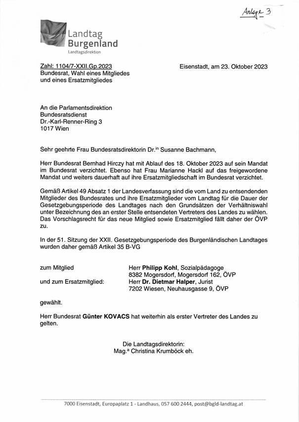 Schreiben des Burgenländischen Landtages betreffend Mandatsverzichte und Wahl eines Mitgliedes und Ersatzmitgliedes des Bundesrates (Anlage 3)
