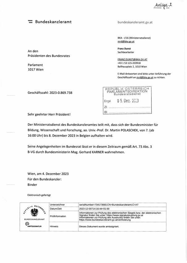 Schreiben des Ministerratsdienstes betreffend den Aufenthalt von Herrn Bundesminister für Bildung, Wissenschaft und Forschung Dr. Martin Polaschek am 7. Dezember 2023 (ab 16 Uhr) und 8. Dezember 2023 in Belgien (Anlage 2)