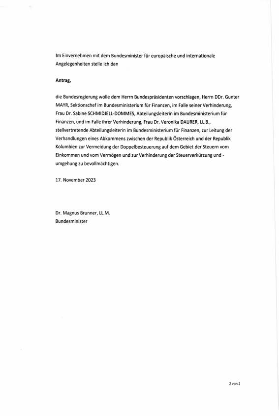 Schreiben des Bundesministers für Finanzen betreffend Vollmacht zur Aufnahme von Verhandlungen über den Neuabschluss eines Abkommens zwischen der Republik Österreich und der Republik Kolumbien zur Vermeidung der Doppelbesteuerung auf dem Gebiet der Steuern vom Einkommen und vom Vermögen und zur Verhinderung der Steuerverkürzung und -umgehung (Anlage 2)