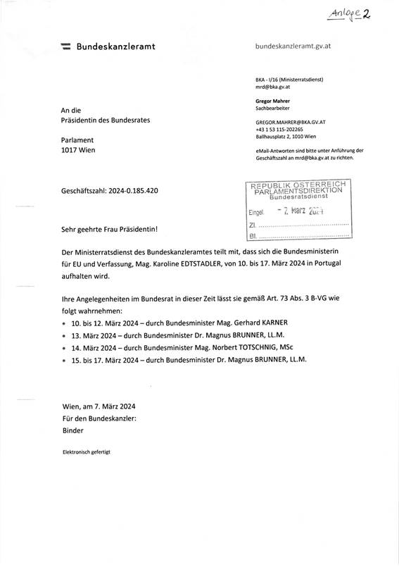 Schreiben des Bundeskanzleramtes betreffend Aufenthalt eines Mitglieds der Bundesregierung in einem anderen Mitgliedstaat der Europäischen Union ...................................... 59