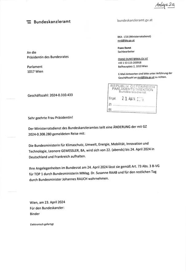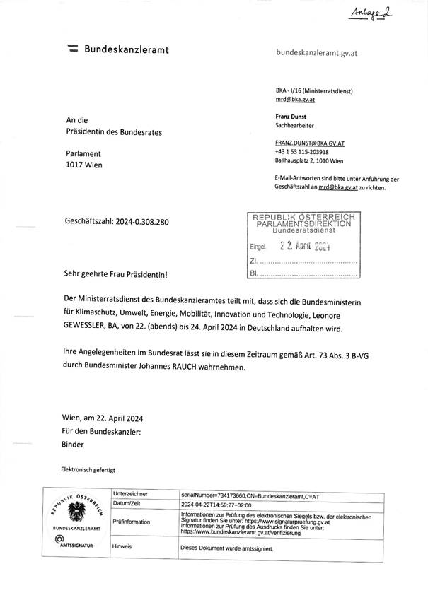 Schreiben des Bundeskanzleramtes betreffend Aufenthalt eines Mitglieds der Bundesregierung in einem anderen Mitgliedstaat der Europäischen Union .............................. 63, 64