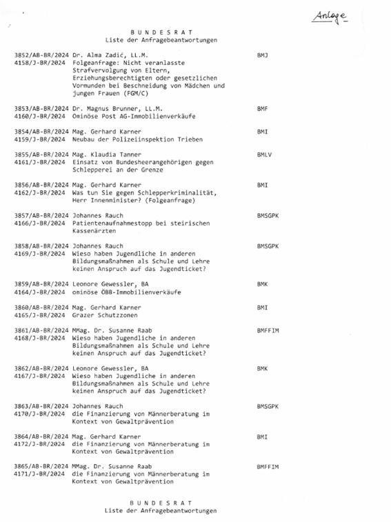 Vizepräsident Mag. Franz Ebner: Ich gebe bekannt, dass seit der letzten beziehungsweise in der heutigen Sitzung insgesamt 13 Anfragen, 4183/J-BR/2024 bis 4195/J-BR/2024, eingebracht wurden. (Bundesrat Schreuder – in Richtung der den Saal verlassenden Bundesrät:innen der FPÖ –: So sind sie: Da verlängern sie die Sitzung und dann gehen sie alle! – Bundesrätin Schumann – in Richtung FPÖ –: Schönes Wochenende!)