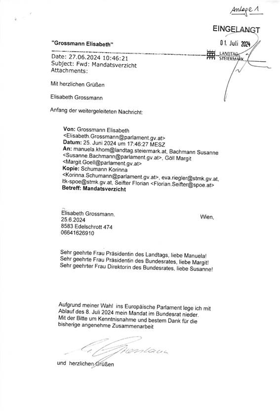 Schreiben des Steiermärkischen Landtages betreffend Mandatsverzicht (Anlage 1)