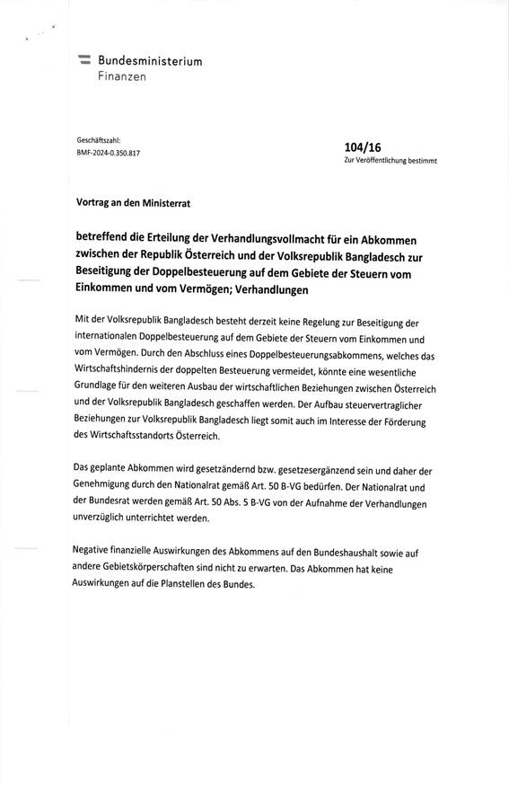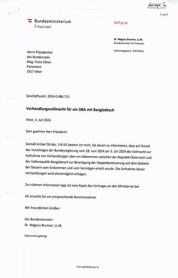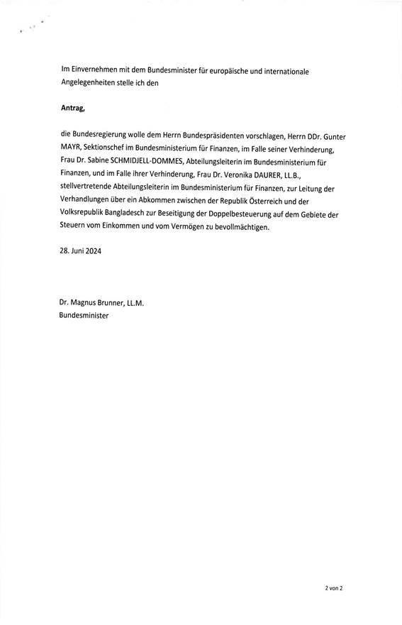 Schreiben des Bundesministers für Finanzen betreffend Vollmacht zur Aufnahme von Verhandlungen über ein Abkommen zwischen der Republik Österreich und der Volksrepublik Bangladesch zur Beseitigung der Doppelbesteuerung auf dem Gebiete der Steuern vom Einkommen und vom Vermögen (Anlage 2)