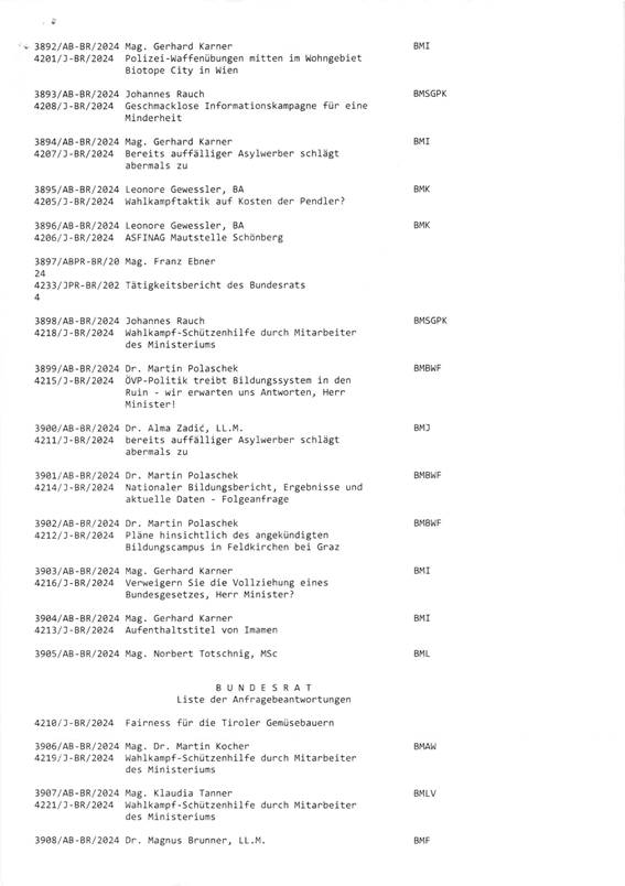 Ich gebe weiters bekannt, dass von den Bundesräten Franz Ebner, Korinna Schumann, Christoph Steiner, Marco Schreuder, Kolleginnen und Kollegen gemäß § 66 der Geschäftsordnung des Bundesrates der Antrag auf Abhaltung einer parlamentarischen Enquete zum Thema „Demokratie braucht Zukunft – Brücken bauen, Demokratie stärken“ eingebracht wurde.