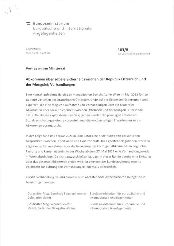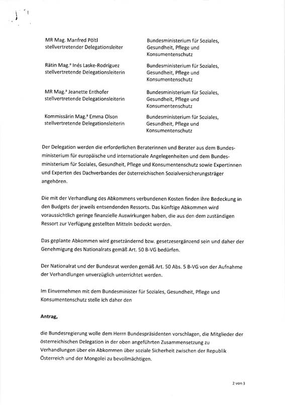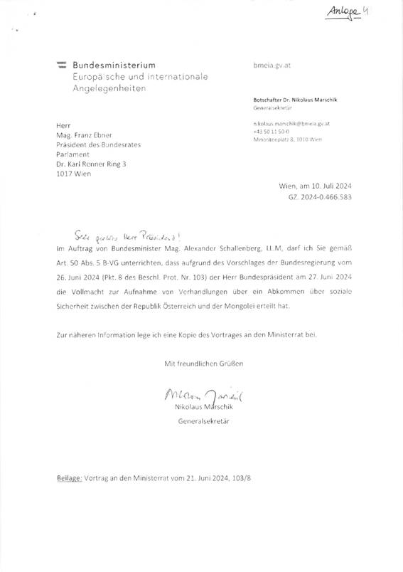 Schreiben des Generalsekretärs für auswärtige Angelegenheiten im Bundesministerium für europäische und internationale Angelegenheiten betreffend Vollmacht zur Aufnahme von Verhandlungen über ein Abkommen über soziale Sicherheit zwischen der Republik Österreich und der Mongolei (Anlage 4)