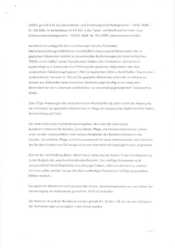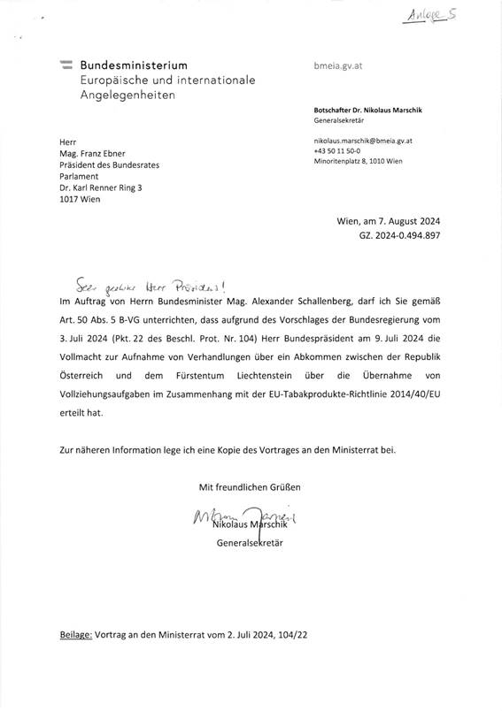 Schreiben des Generalsekretärs für auswärtige Angelegenheiten im Bundesministerium für europäische und internationale Angelegenheiten betreffend Vollmacht zur Aufnahme von Verhandlungen über ein Abkommen zwischen der Republik Österreich und dem Fürstentum Liechtenstein über die Übernahme von Vollziehungsaufgaben im Zusammenhang mit der EU-Tabakprodukte-Richtlinie 2014/40/EU (Anlage 5)
