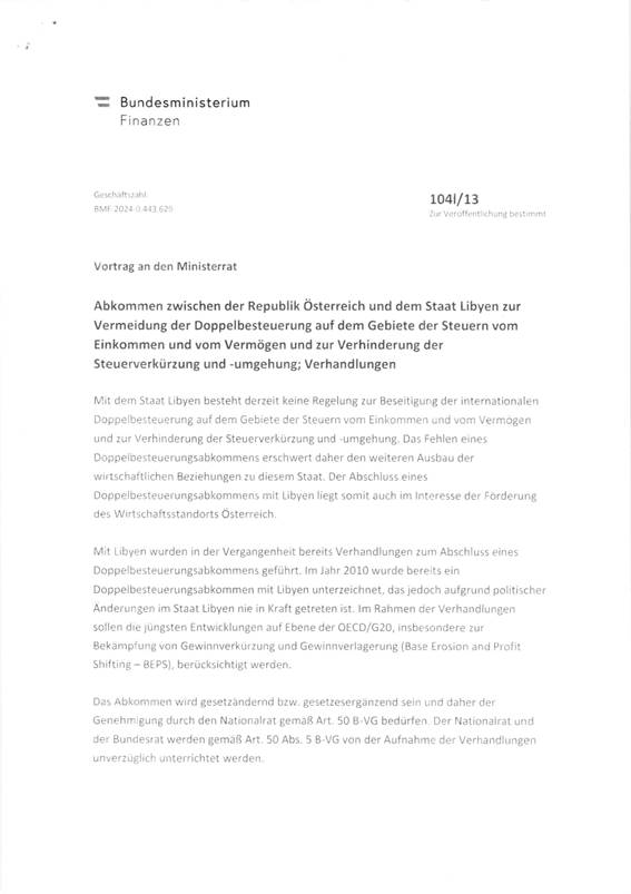 Schreiben des Bundesministers für Finanzen betreffend Vollmacht zur Aufnahme von Verhandlungen über ein Abkommen zwischen der Republik Österreich und dem Staat Libyen zur Vermeidung der Doppelbesteuerung auf dem Gebiete der Steuern vom Einkommen und vom Vermögen und zur Verhinderung der Steuerverkürzung und ‑umgehung (Anlage 6)