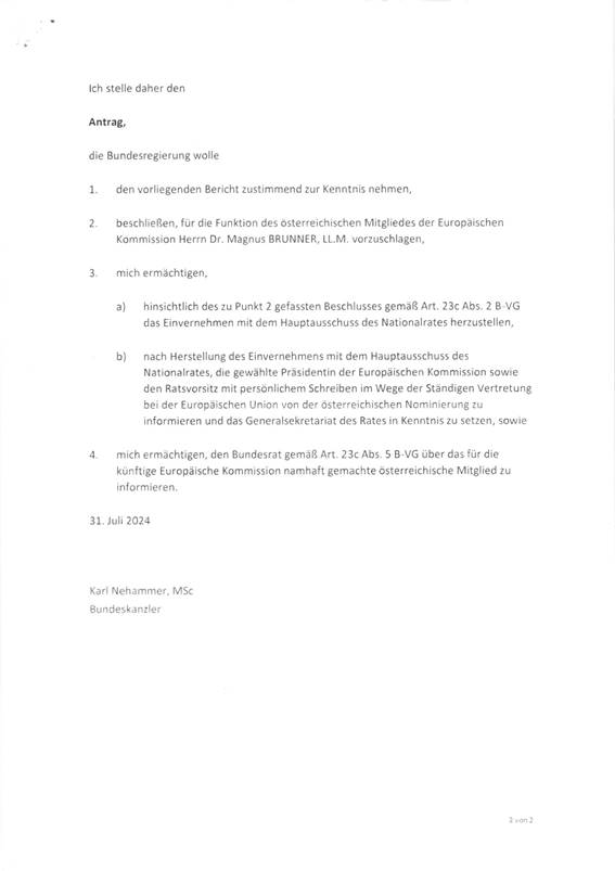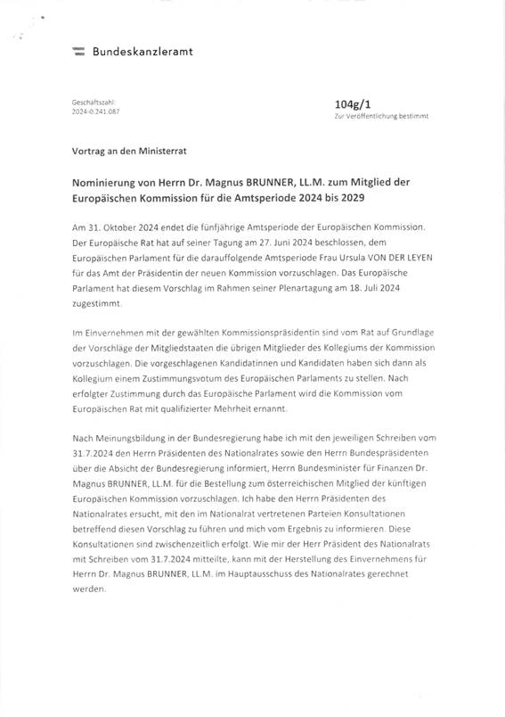 Nominierung von Herrn Bundesminister für Finanzen Dr. Magnus Brunner, LL.M. zum österreichischen Mitglied der Europäischen Kommission für die Amtsperiode 2024 bis 2029 (Anlage 7)