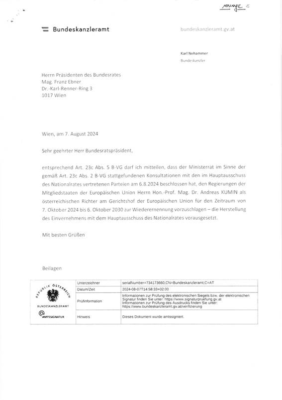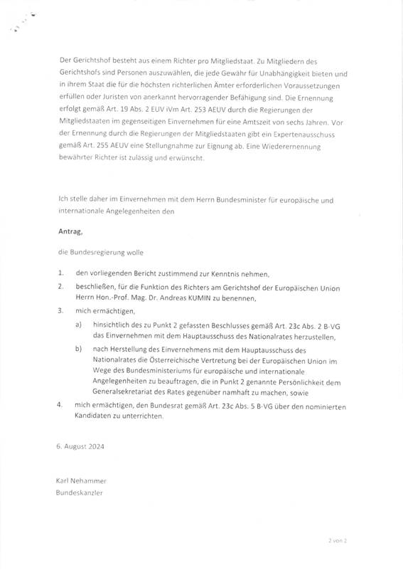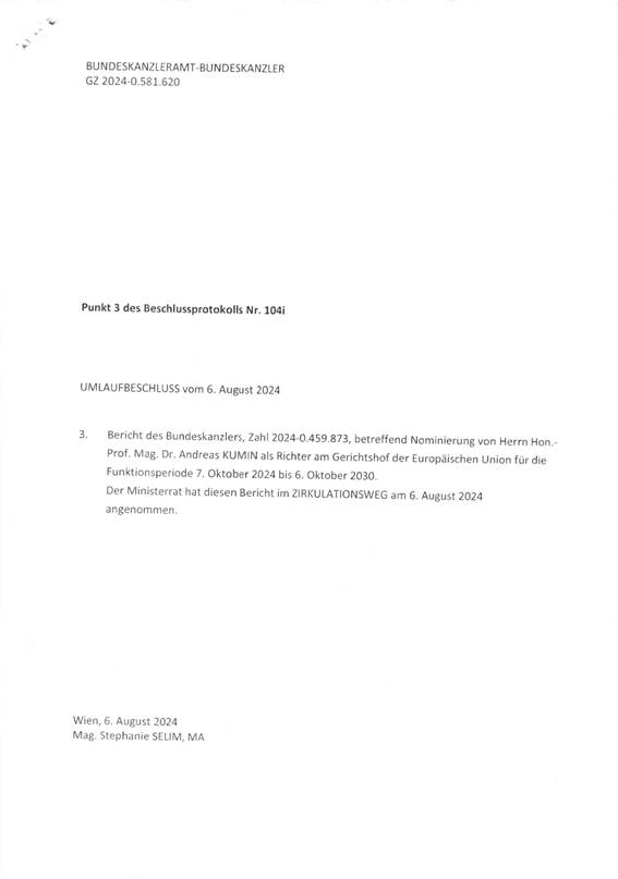 Nominierung von Herrn Hon.-Prof. Mag. Dr. Andreas Kumin als österreichischer Richter am Gerichtshof der Europäischen Union für die Funktionsperiode 7. Oktober 2024 bis 6. Oktober 2030 (Anlage 8)