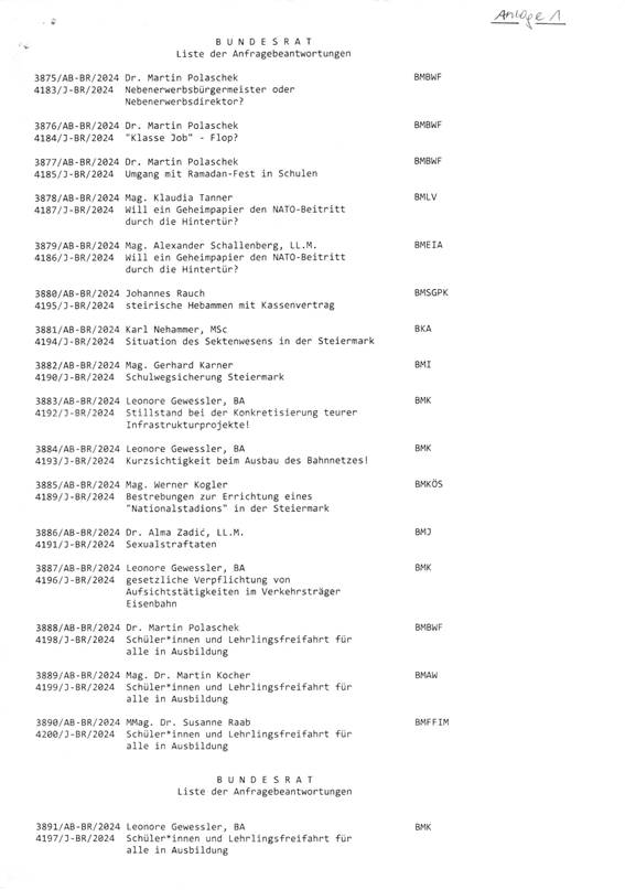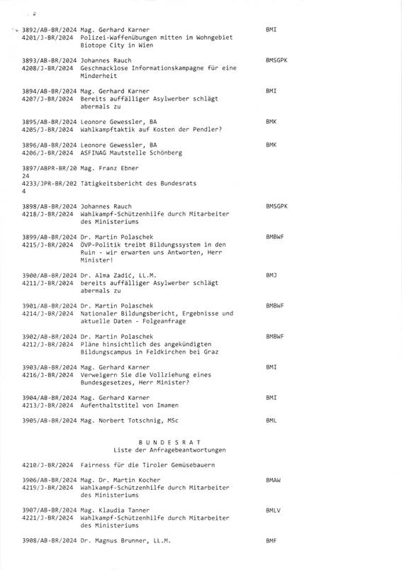 Präsident Mag. Franz Ebner: Ich gebe noch bekannt, dass seit der letzten beziehungsweise in der heutigen Sitzung insgesamt 91 Anfragen – 4234/J-BR/2024 bis 4324/J-BR/2024 – eingebracht wurden.