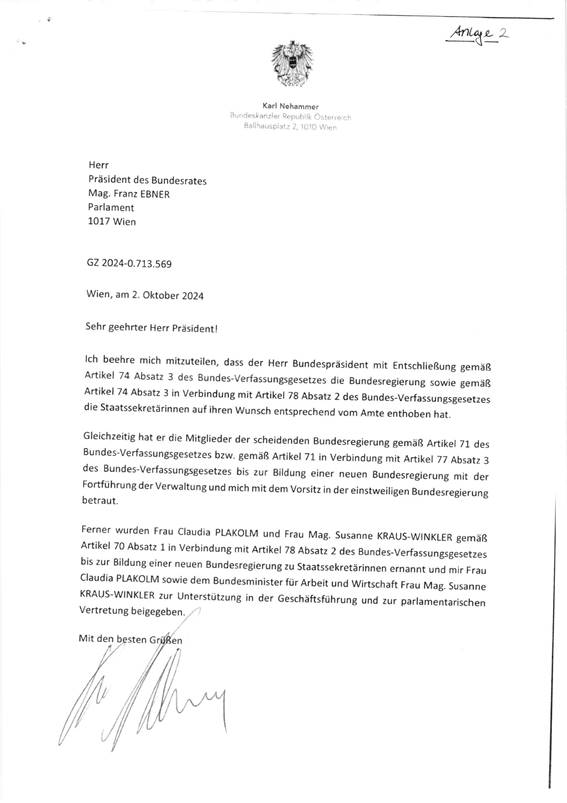 Schreiben des Bundeskanzlers betreffend Amtsenthebung der Bundesregierung gemäß Art. 74 Abs. 3 B-VG sowie der Staatsekretärinnen gemäß Art. 74 Abs. 3 B-VG iVm Art. 78 Abs. 2 B-VG bei gleichzeitiger Betrauung der scheidenden Mitglieder der Bundesregierung gemäß Art. 71 B-VG iVm Art. 77 Abs. 3 B-VG bis zur Bildung einer neuen Bundesregierung mit der Fortführung der Verwaltung und Betrauung des Herrn Bundeskanzlers als Vorsitzenden der einstweiligen Bundesregierung sowie betreffend Ernennung von Frau Claudia Plakolm zur Staatssekretärin zur Unterstützung in der Geschäftsführung und zur parlamentarischen Vertretung des Bundeskanzlers und von Frau Mag. Susanne Kraus-Winkler zur Staatssekretärin zur Unterstützung in der Geschäftsführung und zur parlamentarischen Vertretung des Bundesministers für Arbeit und Wirtschaft gemäß Art. 70 Abs. 1 iVm Art. 78 Abs. 2 B-VG bis zur Bildung der neuen Bundesregierung durch den Bundespräsidenten ............ 73