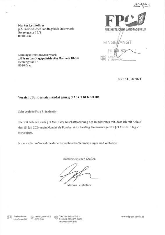 Schreiben des Steiermärkischen Landtages betreffend Mandatsverzicht des Bundesrates Markus Leinfellner ...................................................................................................................... 74