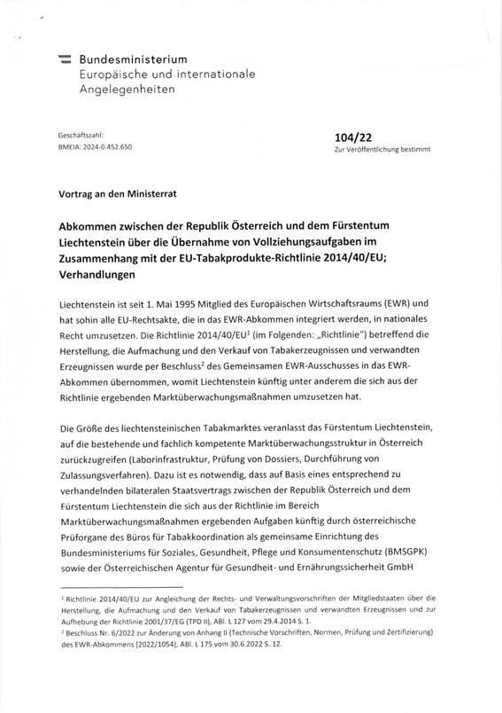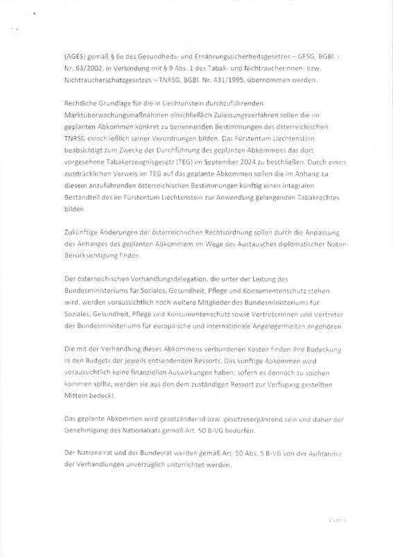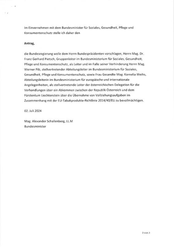 Schreiben des Generalsekretärs für auswärtige Angelegenheiten im Bundesministerium für europäische und internationale Angelegenheiten gemäß Art. 50 Abs. 5 B-VG betreffend Erteilung der Vollmacht zur Aufnahme von Verhandlungen über ein Abkommen zwischen der Republik Österreich und dem Fürstentum Liechtenstein über die Übernahme von Vollziehungsaufgaben im Zusammenhang mit der EU-Tabakprodukte-Richtlinie 2014/40/EU durch den Bundespräsidenten ................................................................................... 79
