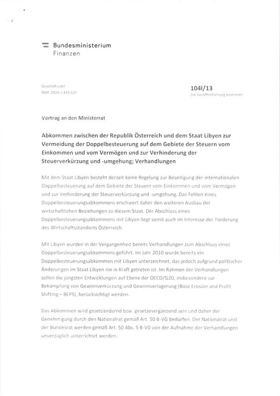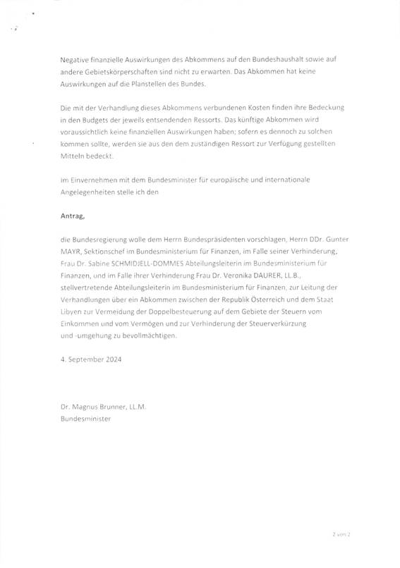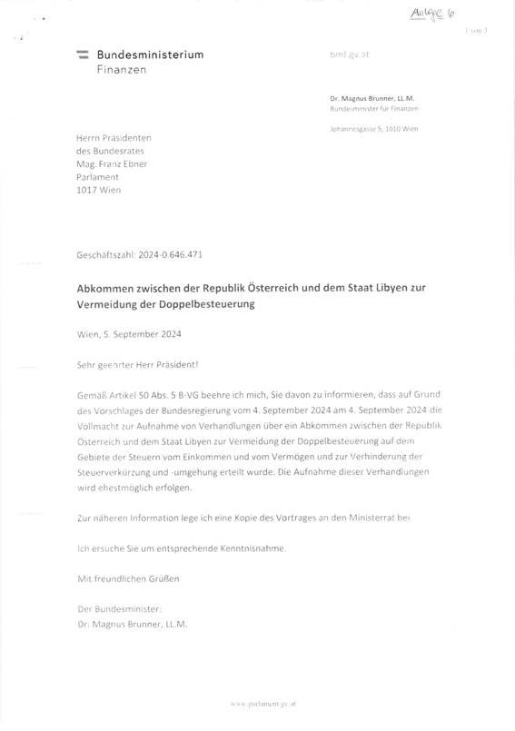Schreiben des Bundesministers für Finanzen gemäß Art. 50 Abs. 5 B-VG betreffend Erteilung der Vollmacht zur Aufnahme von Verhandlungen über ein Abkommen zwischen der Republik Österreich und dem Staat Libyen zur Vermeidung der Doppelbesteuerung auf dem Gebiete der Steuern vom Einkommen und vom Vermögen und zur Verhinderung der Steuerverkürzung und -umgehung durch den Bundespräsidenten ............................................................... 83