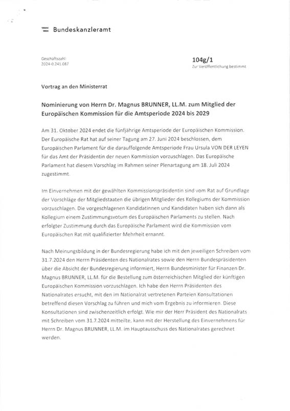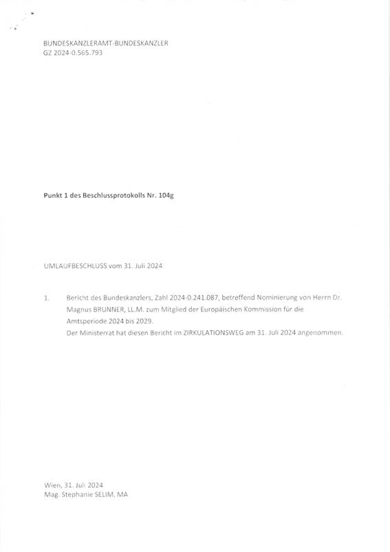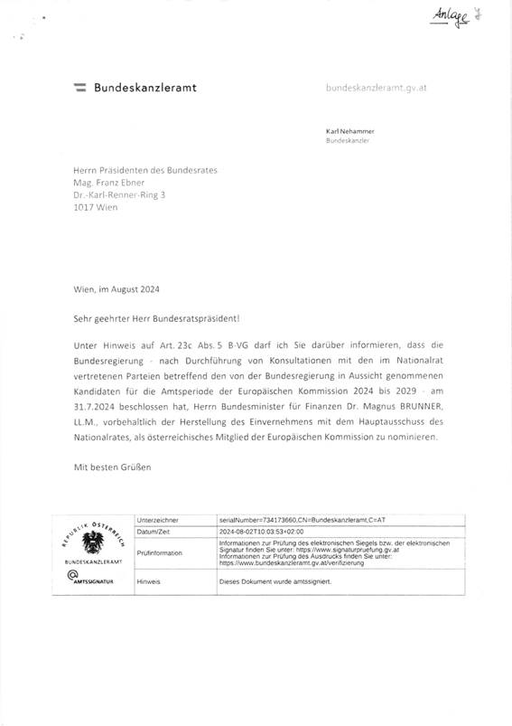 Schreiben des Bundeskanzlers Karl Nehammer, MSc gemäß Art. 23c Abs. 5 B-VG betreffend Nominierung von Herrn Bundesminister für Finanzen Dr. Magnus Brunner, LL.M. zum österreichischen Mitglied der Europäischen Kommission für die Amtsperiode 2024 bis 2029 ............................................................................................................................... 88
