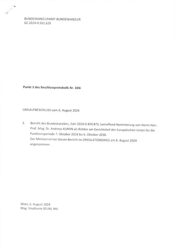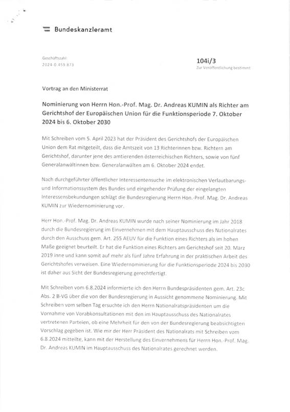 Schreiben des Bundeskanzlers Karl Nehammer, MSc gemäß Art. 23c Abs. 5 B-VG betreffend Nominierung von Herrn Hon.-Prof. Mag. Dr. Andreas Kumin als österreichischen Richter am Gerichtshof der Europäischen Union für die Funktionsperiode 7. Oktober 2024 bis 6. Oktober 2030 .............................................................................................................................. 92