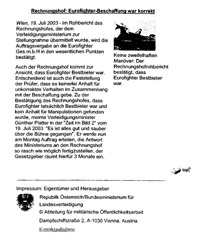 Aussendung vom 21. Juli 2003 unter dem Titel „Eurofighter: Der RH-Rohbericht