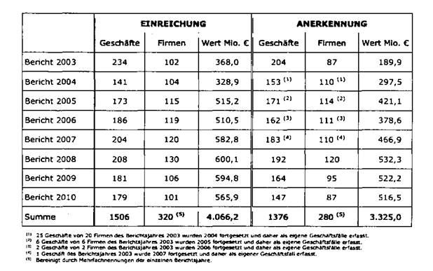 Das Bundesministerium für Wirtschaft, Familie und Jugend (vormals Bundesministerium für Wirtschaft und Arbeit) hat per Stichtag 25.05.2012 folgende durchgeführten Gegengeschäfte angerechnet: