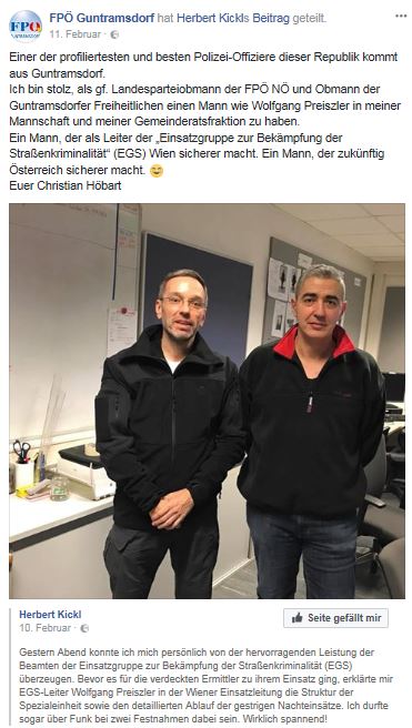 Durchgeführt bzw. unterstützt wurde die Aktion von der Einsatzgruppe zur Bekämpfung der Straßenkriminalität (EGS), die vom FPÖ-Funktionär Wolfgang Preiszler geleitet wird, über den der geschäftsführende Parteiobmann der FPÖ Niederösterreich, Christian Höbart im Februar auf Facebook berichtete, er sei stolz darauf, ihn „in meiner Mannschaft […] zu haben“.