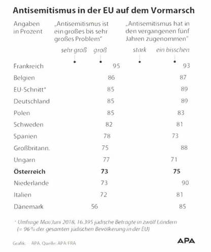 Im Ländervergleich zeigt die Studie im Wesentlichen ein ähnliches Niveau von Antisemitismus in ganz Europa. In Österreich stellt für 73 Prozent der Befragten Antisemitismus ein großes Problem dar, wobei 75 Prozent meinten, Judenfeindlichkeit habe in den vergangenen fünf Jahren zugenommen und 33 Prozent sogar eine starke Zunahme feststellen.
