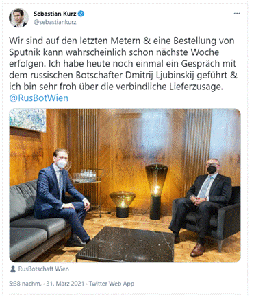 - Aus diesem Grund verkündet Ex-Bundeskanzler Kurz dazu, sich für den Ankauf des russischen “Sputnik V”-Impfstoff stark zu machen - Foto mit dem russischen Botschafter Dmitrij Ljubinskij inklusive. Es gab keine Zulassung des Impfstoffes und bis heute wird er nicht als gültige Impfung anerkannt. Schließlich erklärt der Bundeskanzler in einer Anfragebeantwortung, er sei nicht zuständig.