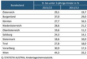Bereits 2002 wurden auf EU-Ebene die Barcelona Ziele zur frühkindlichen Betreuung, Bildung und Erziehung beschlossen. Laut diesen Zielen war eine Betreuungsquote von mindestens 33% bei den unter 3 Jährigen und von mindestens 90% bei 3-5 Jährigen bis 2010 geplant. Weder bis 2010 noch bis zum heutigen Tag werden diese Mindeststandards bei den unter 3 Jährigen von Österreich erreicht. Die Betreuungsquoten sind laut Statistik Austria in den Bundesländern sehr unterschiedlich: