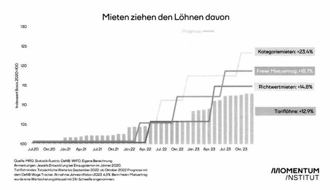Die Richtwertmieten sind im April 2022 um 5,85% gestiegen, im April 2023 erhöhten sie sich um 8,6%, weil die Regierung die Anträge der SPÖ auf ein Aussetzen der Erhöhung mehrmals abgelehnt hatte. Wenn die Politik nicht eingreift, werden sich die Richtwertmieten angesichts der Inflationsprognosen der Wirtschaftsforschungsinstitute bis April 2025 um weitere 11% erhöhen, sie wären dann nach den Erhöhungen 2022 (5,85%), 2023 (8,6%) in drei Jahren um mehr als 25% gestiegen sein.