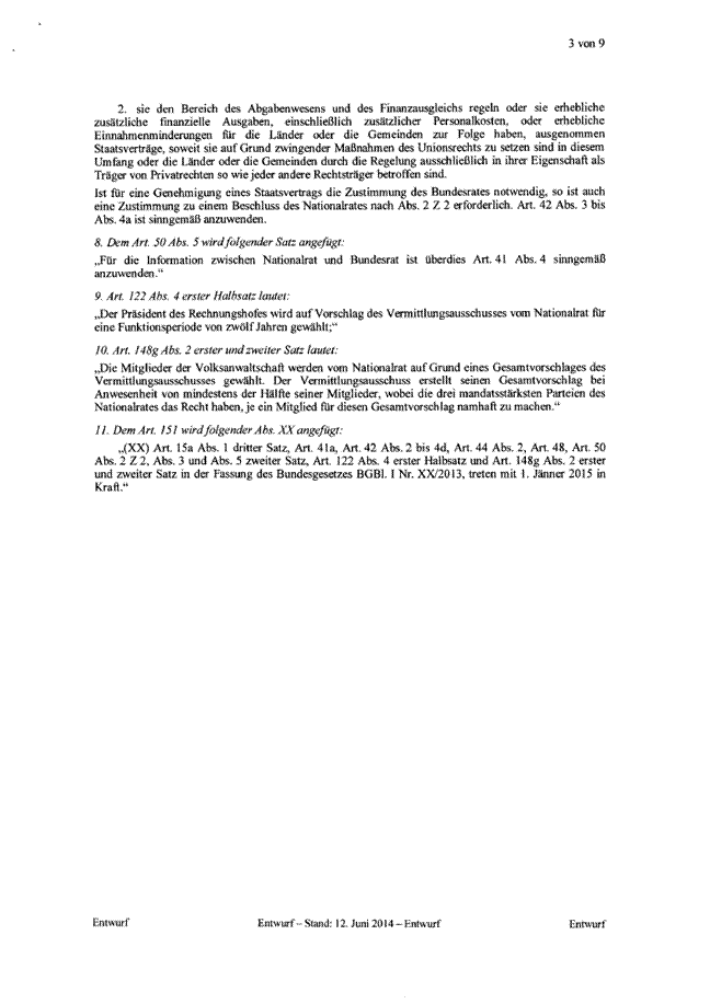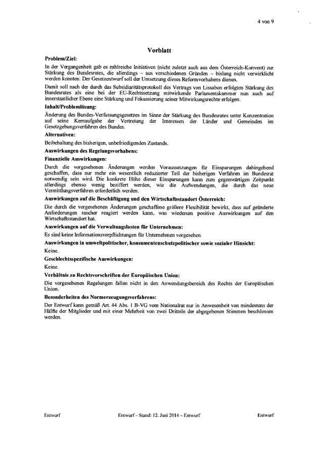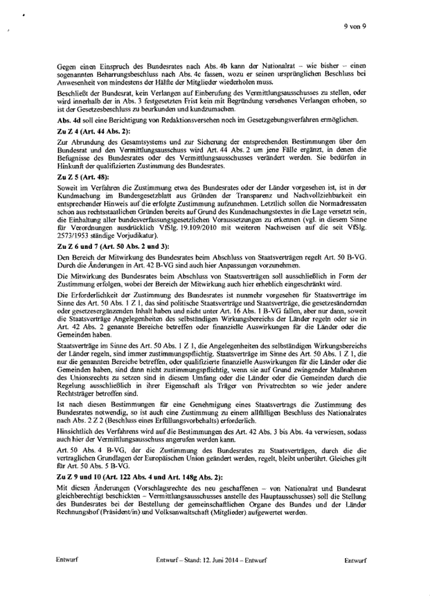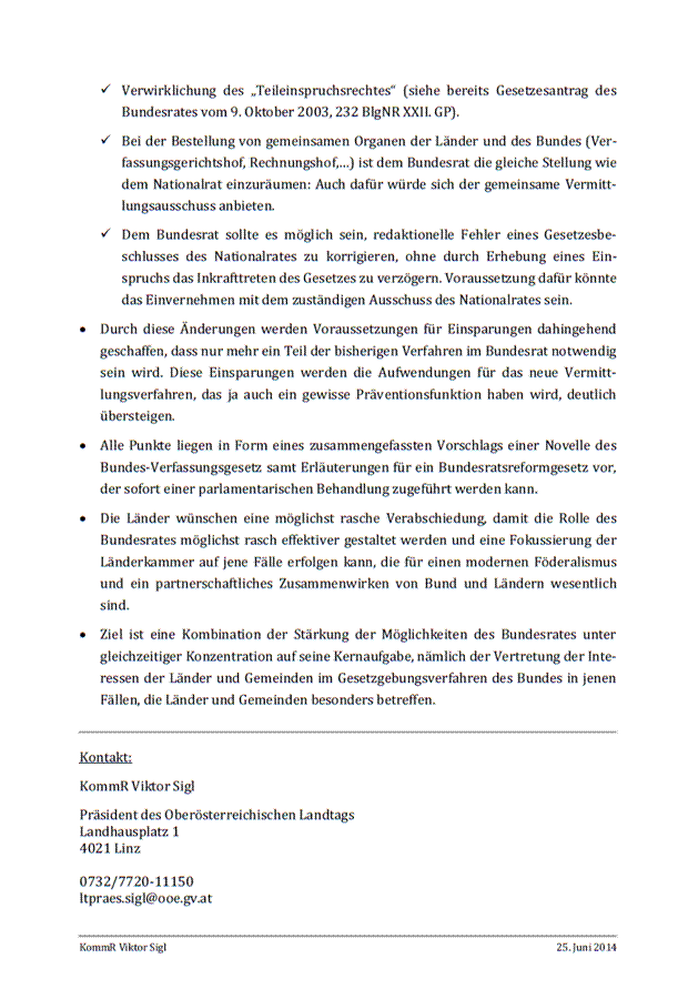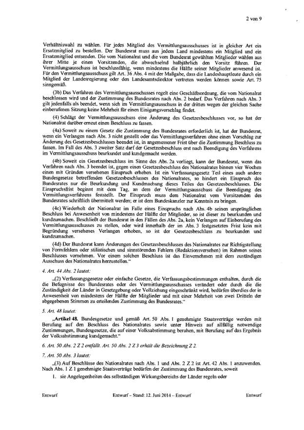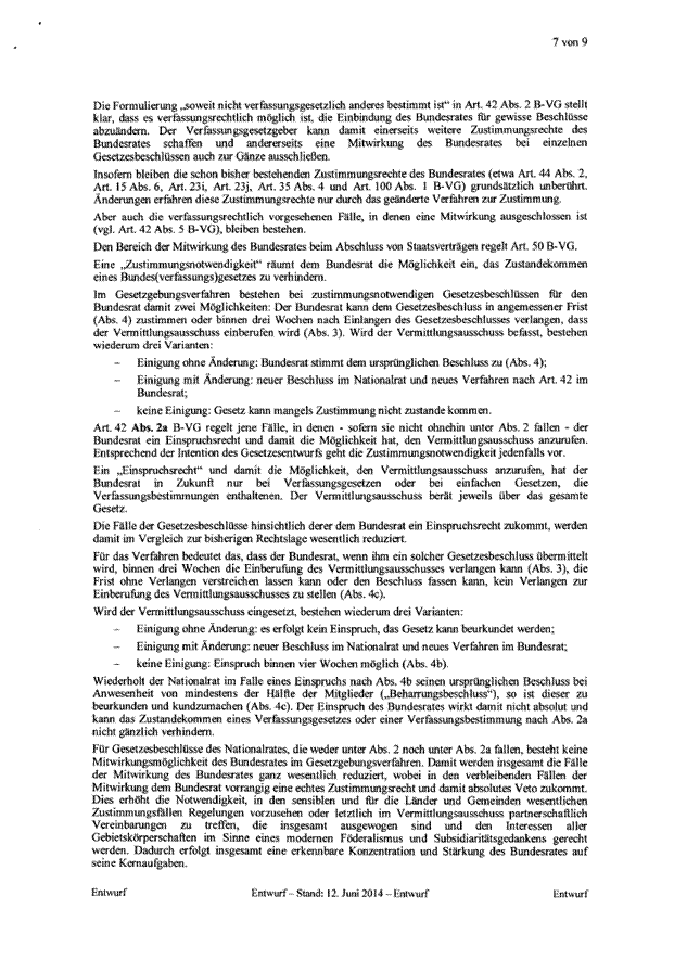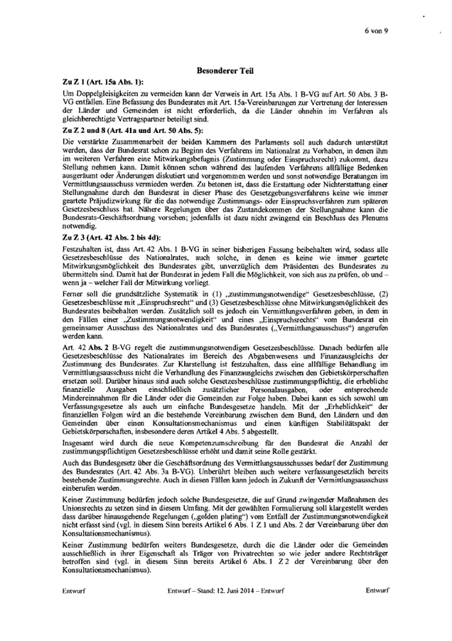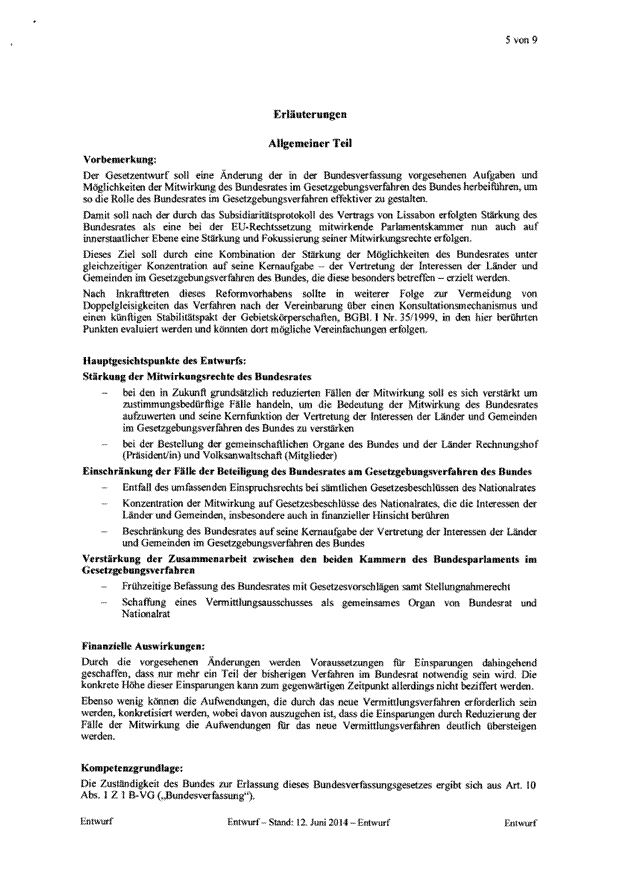 Es sieht eine Aufgabenentflechtung vor. Das derzeit bestehende umfassende Einspruchsrecht des Bundesrates entfällt. Der Bundesrat erhält ein Zustimmungsrecht zu Verfassungsänderungen sowie zu Gesetzesbeschlüssen des Nationalrates, die für die Länder mit erheblichen Kostenfolgen verbunden sind. Um die Vetowirkung des Zustimmungsrechts abzumildern, wird ein Vermittlungsverfahren eingeführt.