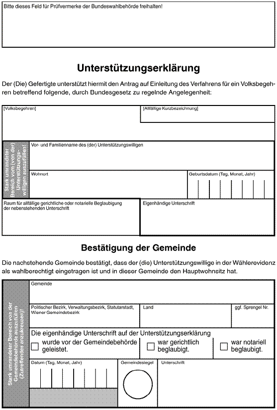 Die nachstehend unterfertigten Stimmberechtigten begehren auf Grund des Art. 41 Abs. 2 B-VG die Regelung der den Gegenstand des oben angeführten Volksbegehrens bildenden Angelegenheit durch Bundesgesetz.