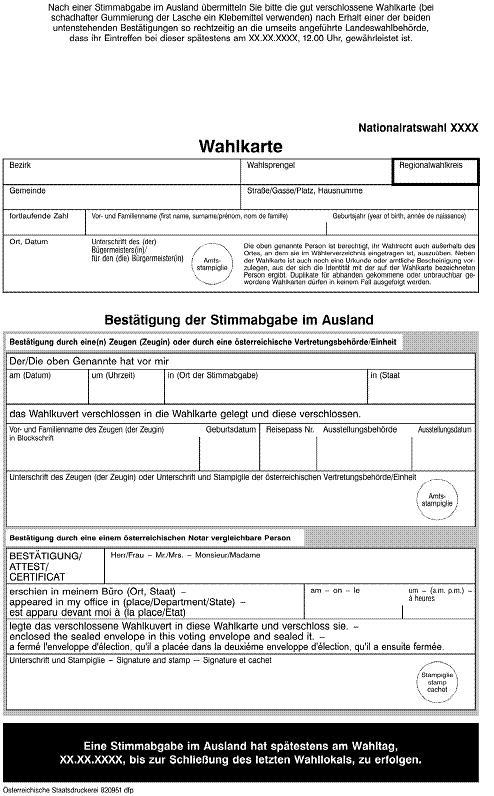 “(4) Weiters kann die Bestätigung durch einen volljährigen Zeugen mit österreichischer Staatsbürgerschaft erfolgen, der über einen gültigen österreichischen Reisepaß verfügt, dessen Ausstellungsdaten bei sonstiger Nichtigkeit der Stimmabgabe auf der Wahlkarte einzutragen sind.”