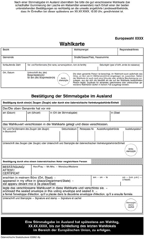 “(4) Weiters kann die Bestätigung durch einen wahlberechtigten Unionsbürger erfolgen, der über einen gültigen Reisepaß eines Mitgliedstaates der Europäischen Union verfügt, dessen Ausstellungsdaten bei sonstiger Nichtigkeit der Stimmabgabe auf der Wahlkarte einzutragen sind.”