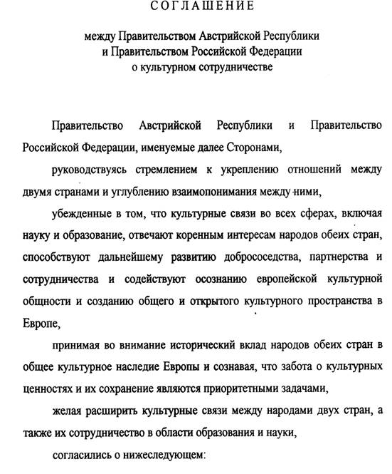 Der Einleitungsartikel legt die gemeinsame Zielsetzung der Vertragsparteien fest, die gegenseitige Verbreitung von Kenntnissen in bezug auf die Kultur ihrer Länder zu fördern. Dazu kommt die Verpflichtung beider Seiten, alle Initiativen zur Weiterentwicklung einer umfassenden kulturellen Partnerschaft auf allen Ebenen zu unterstützen. Die ausdrückliche Erwähnung der regionalen und lokalen Ebenen war hier ein besonderes österreichisches Anliegen, um damit Projekte der direkten Zusammenarbeit – etwa mit einzelnen russischen Städten – zu erfassen.