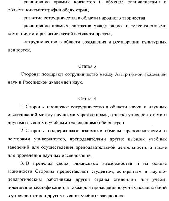 3. Nach Maßgabe der finanziellen Möglichkeiten und auf der Grundlage der Gegenseitigkeit gewähren die Vertragsparteien Studierenden, graduierten Akademikern und Wissenschaftern der jeweils anderen Vertragspartei Stipendien zur Aus- und Fortbildung sowie zu Forschungsarbeiten an Universitäten und anderen Hochschuleinrichtungen.