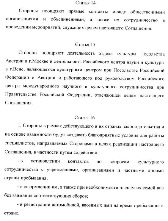 Aus der Sicht der derzeit – dh. noch im Rahmen der Weiteranwendung des Kulturabkommens vom 22. März 1968 (BGBl. Nr. 319/1969) – auf dem Gebiet der Russischen Föderation in kulturellen Bereichen tätigen Österreicher und Österreicherinnen war es ein gewichtiges Anliegen, daß im neuen österreichisch-russischen Kulturabkommen ihre Arbeitsbedingungen verbessert werden, und zwar insbesondere im Bereich der Einreise- und Ausreisesichtvermerke und anderer administrativer Genehmigungen. Es konnten aber angesichts der restriktiven Haltung, die sowohl in Österreich als auch in der Russischen Föderation namentlich bei der Gewährung von Aufenthalts- oder Arbeitsgenehmigungen herrscht, die betreffenden Regelungen lediglich als Zusagen des Bemühens formuliert werden, die allerdings in der Praxis – etwa im Umgang mit den russischen Behörden am Einsatzort – von Nutzen sein sollten. Konkret und verbindlich ist die beiderseitige Verpflichtung, erforderliche Sichtvermerke an den betreffenden Personenkreis gebührenfrei zu erteilen. Auch die Festlegung, daß die auf dem Hoheitsgebiet des anderen Staates in der Kulturarbeit tätigen eigene Fachkräfte unmittelbar mit den Einrichtungen und Organisatonen ihres Umfeldes und mit Privatpersonen zusammenarbeiten könnten, kann in der Praxis von Nutzen sein, wenngleich sie ist aus heutiger Sicht inhaltlich unbestritten sein sollte.