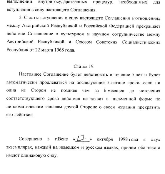 Diese Artikel enthalten die in bilateralen völkerrechtlichen Verträgen üblichen Schlußbestimmungen. Das Abkommen gilt vorerst auf fünf Jahre; seine Geltung verlängert sich danach jeweils für weitere Zeiträume von fünf Jahren. Die Aufkündigung ist für jede Seite zum Ablauftermin des jeweils laufenden Fünfjahreszeitraumes möglich, und zwar unter Einhaltung einer Kündigungsfrist von sechs Monaten. Mit dem Inkrafttreten des Abkommens tritt das Kulturabkommens aus 1968 (BGBl. Nr. 319/1969), das im Verhältnis etwa zur Ukraine und zu anderen Nachfolgestaaten der ehemaligen UdSSR nicht in Geltung stand, nun auch im österreichisch-russischen Verhältnis außer Kraft.