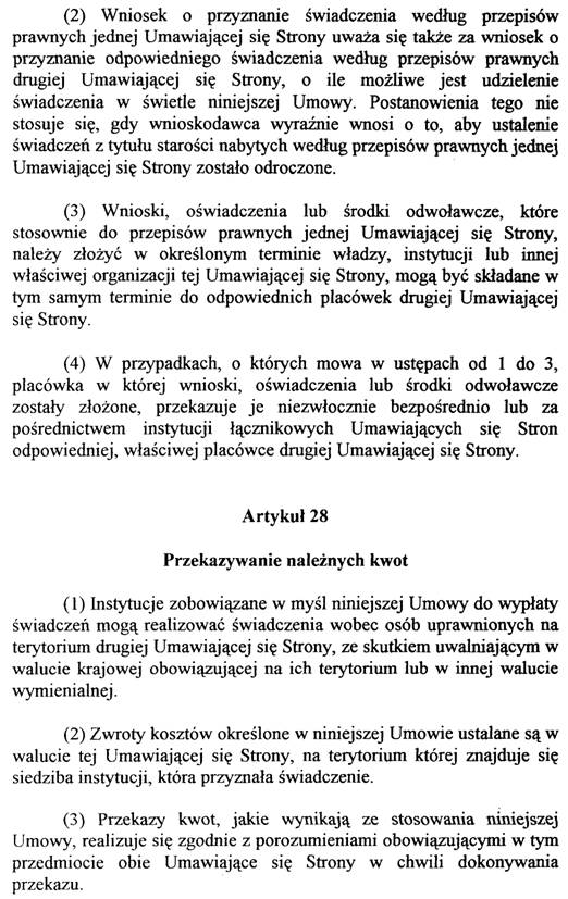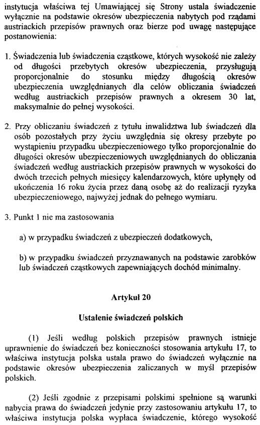 Art. 20 sieht die erforderlichen Regelungen für die Feststellung der Leistungen nach den polnischen Rechtsvorschriften vor, wobei bei Anspruch allein auf Grund der polnischen Versicherungszeiten – wie auf österreichischer Seite – die Berechnung der Leistungen nach innerstaatlichem Recht vorgesehen ist (Abs. 1), während in Fällen, in denen der Anspruch nur unter Berücksichtigung der österreichischen Versicherungszeiten besteht, die Leistungen nach der Pro-rata-Methode berechnet werden (Abs. 2).