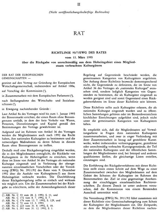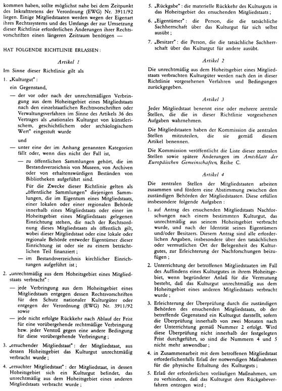 § 1. Dieses Bundesgesetzes regelt gemäß der Richtlinie 93/7/EWG des Rates vom 15. März 1993, Amtsblatt der Europäischen Gemeinschaften Nr. L 74, CELEX‑Nr. 393L0007, die Möglichkeit der Rückforderung von Kulturgütern, welche unrechtmäßig aus dem Hoheitsgebiet eines Mitgliedstaates der Europäischen Gemeinschaft in das Hoheitsgebiet der Republik Österreich oder aus dem Hoheitsgebiet der Republik Österreich in das eines anderen Mitgliedstaates direkt oder indirekt verbracht wurden.