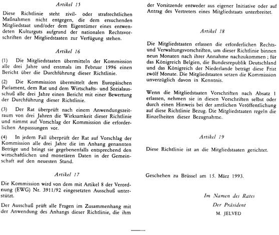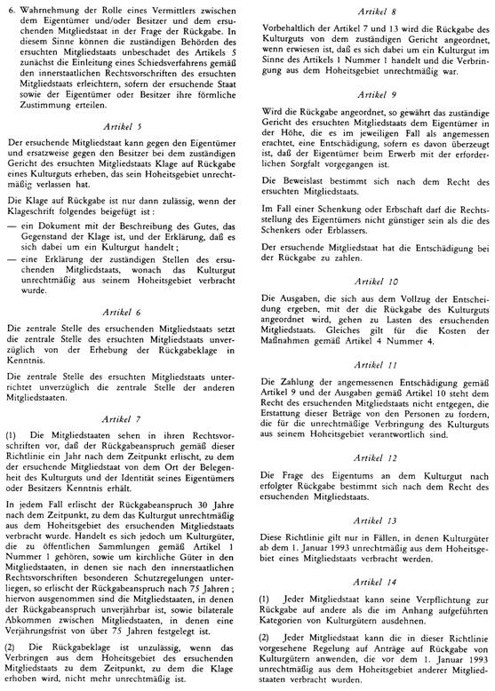 3. Noch nicht eindeutig geklärt ist die Frage von Entschädigungsansprüchen, wenn die Herausgabe auf Grund dieses Bundesgesetzes ohne Entschädigungsverpflichtung des ersuchenden Staates (§ 14 Abs. 1) erfolgen muß. Eine diesbezügliche Judikatur (auch des Europäischen Gerichtshofes), was im Sinne des Art. 9 der Richtlinie als „erforderliche Sorgfalt“ zu gelten hat, steht noch aus.