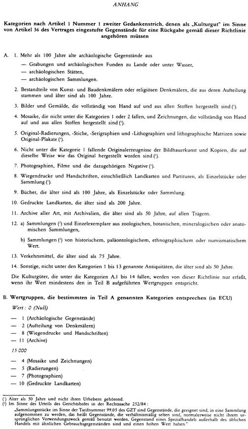 § 2. (1) Als „Kulturgut“ im Sinne dieses Bundesgesetzes gilt ein Gegenstand, der vor oder nach der unrechtmäßigen Verbringung aus dem Hoheitsgebiet eines Mitgliedstaates nach den einzelstaatlichen Rechtsvorschriften oder Verwaltungsverfahren im Sinne des Art. 36 des Vertrages zur Gründung der Europäischen Gemeinschaft wegen seines künstlerischen, geschichtlichen, archäologischen oder sonstigen kulturellen Wertes als „nationales Kulturgut“ eingestuft wurde und