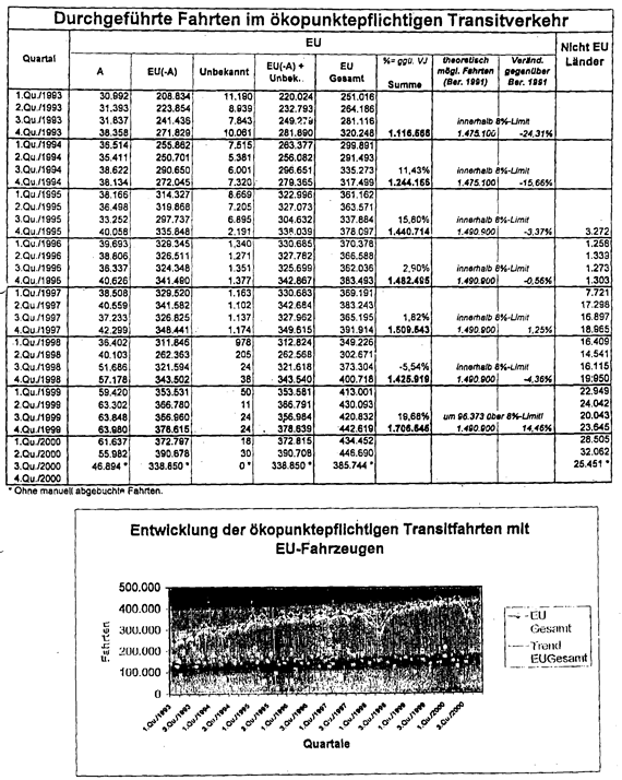 Die Anzahl der ökopunktepflichtigen Fahrten durch Österreich seit 1998 bzw. 1993