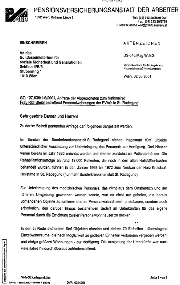 Die Pensionsversicherungsanstalt der Arbeiter hat die an mein Ressort gerichtete