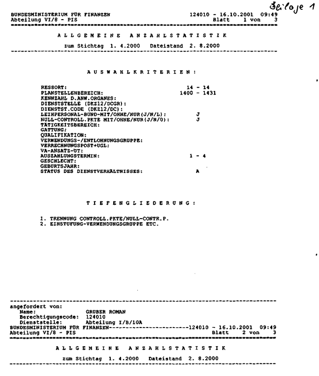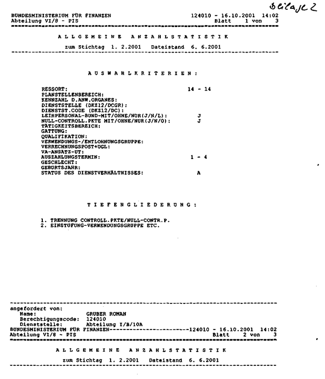 Die PIS-Auswertung “Allgemeine Anzahlstatistik" weist zu den Stichtagen April 2000 (siehe Anfrage 682/J) und Februar 2001 (siehe Anfrage 1974/J) die aus den Anlagen ersichtlichen Zahlen aus (Beilagen l und 2).