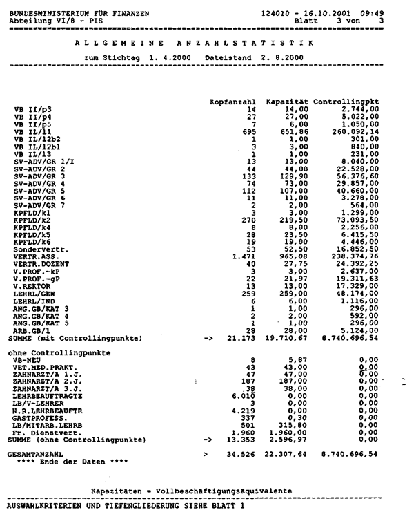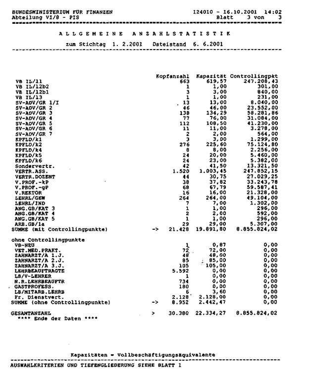 Das Bundesministerium für Bildung, Wissenschaft und Kultur bzw. die Vorgängerressorts haben der Berechnung im Bereich Wissenschaft immer alle Planstellen bzw. Mitarbeiter in Dienstverhältnissen zu Grunde gelegt, nicht jedoch Personen, die außerhalb von Dienstverhältnissen zeitlich befristet oder fallweise für die Universitäten und Universitäten der Künste bzw. die wissenschaftlichen Anstalten tätig sind.